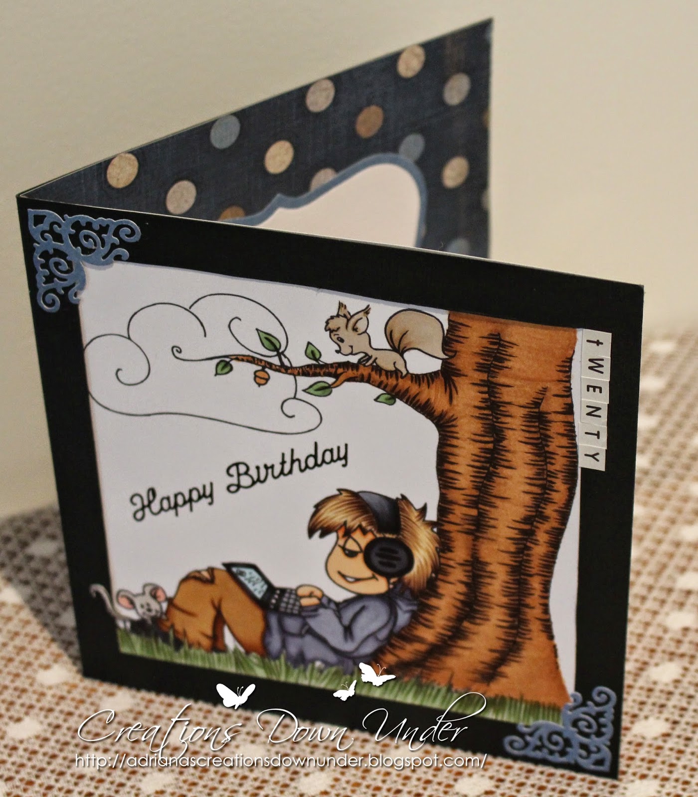 Today's card is for a friend's 20th Birthday. I always look for digital images that in some way reminds me of the person I'm making the card for. Well this guy is really good with computers and I found this digi stamp 'Resting Dude' from Sans Design. I've never coloured such a big scene and was a little scared to add sky and clouds so I left it white. Maybe next time I'll give it a go. I've signed up for Alyce's skin and hair class which I know will help me improve my colouring.